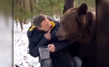 H γιγάντια αρκούδα τρώει κεράσια από τα χείλη του – [video]