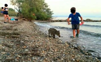Μικρό αγριογουρουνάκι κάνει μπάνιο και παίζει με τους λουόμενους στον Βόλο