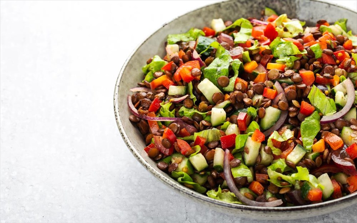 Τα όσπρια είναι πλούσια σε πρωτεΐνη και φυτικές ίνες και αν τα συνδυάσετε με λαχανικά, θα έχετε ένα σούπερ χορταστικό γεύμα. Απολαύστε με ψωμί ολικής ή προσθέστε και καστανό ρύζι στη σαλάτα και θα έχετε πλήρη πρωτεΐνη σε ένα γεύμα.