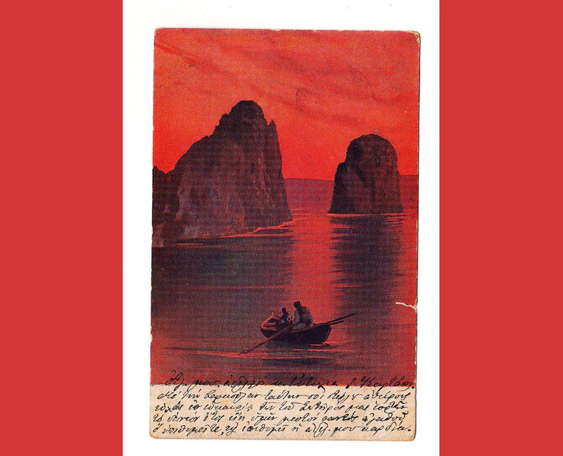 «Αγαπητή μου αδελφή Ευτυχία Ι. Καρταση, με την βαρκούλα ταυτην σοι στέλνω άπειρους ευχάς επ’ ευκαιρία των του Σωτηρος μας εορτών. Το νέον έτος ειη υμιν μεστον παντός αγαθού, ο επιθυμείτε, το επιθυμεί η αδελφική μου καρδιά».