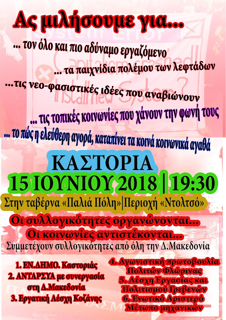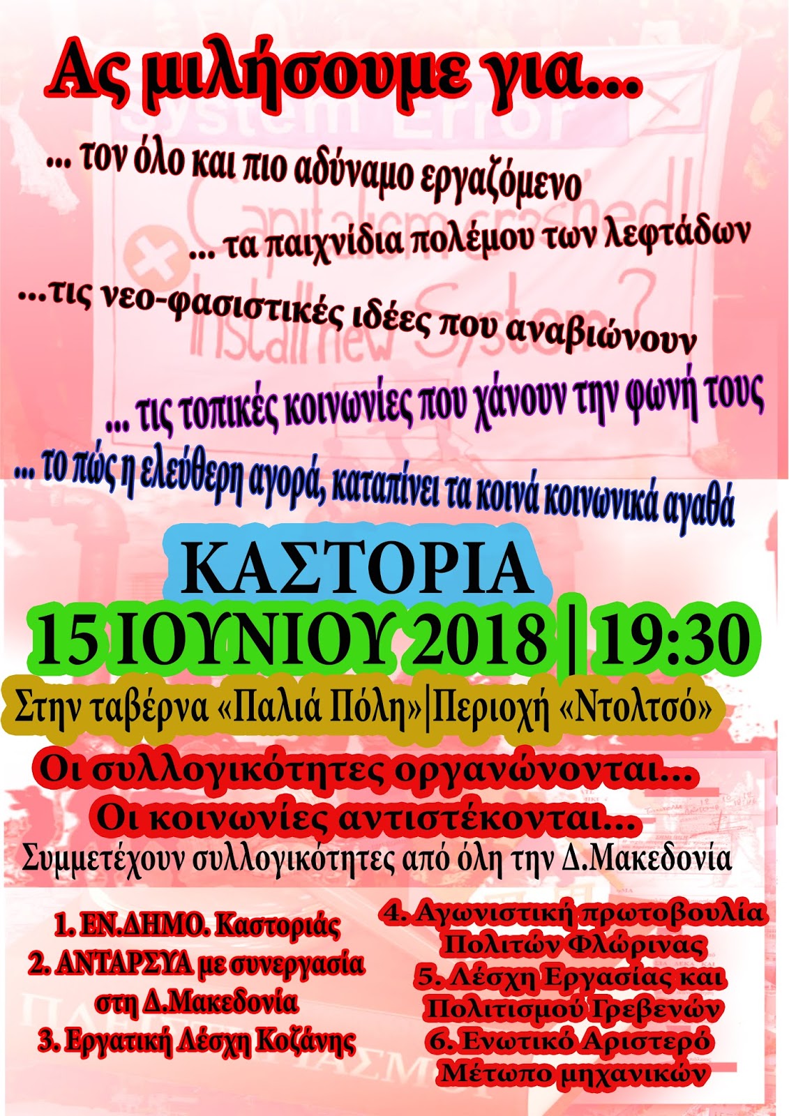 Συναντιόμαστε και προσκαλούμε την Παρασκευή 15-6- 2018 και ωρα 19:30 στη ταβέρνα “Παλιά Πόλη” (περιοχή Ντολτσό) στην Καστοριά ,να συντονίσουμε τον βηματισμό μας και να παρέμβουμε συλλογικά με κριτήριο τα δικαιώματα και τις ανάγκες των εργαζομένων-ανέργων και νεολαίας.