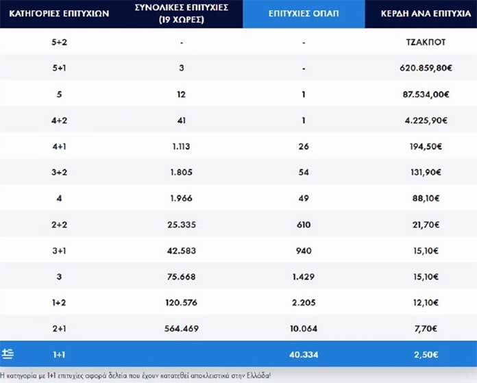 Στη δεύτερη κατηγορία (5+1) βρέθηκαν 3 τυχερά δελτία που κερδίζουν από €620.859,80.