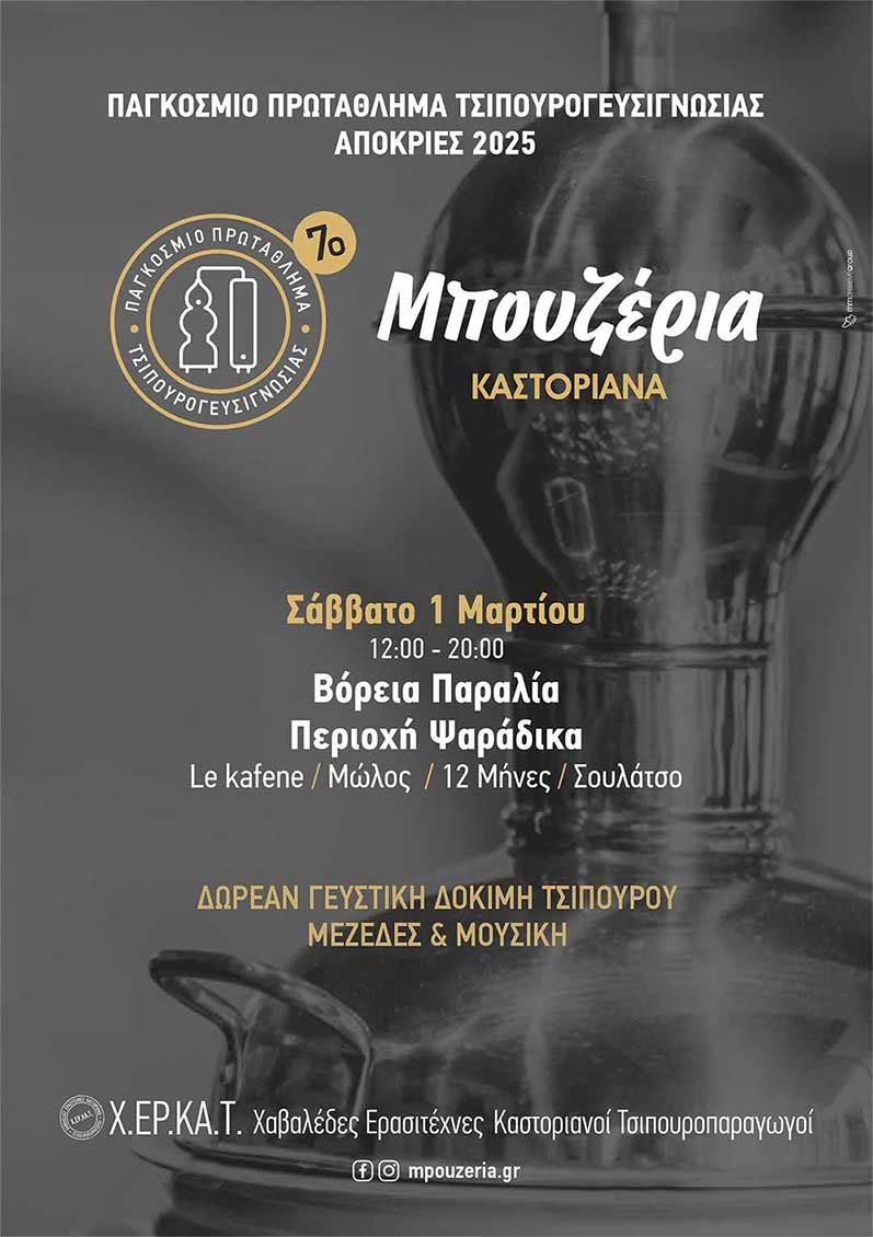 Για 7η χρονιά ο διαγωνισμός τσίπουρου πραγματοποιείται στην Καστοριά και θα λάβει χώρα τις Απόκριες το Σάββατο 1 Μαρτίου 2025!