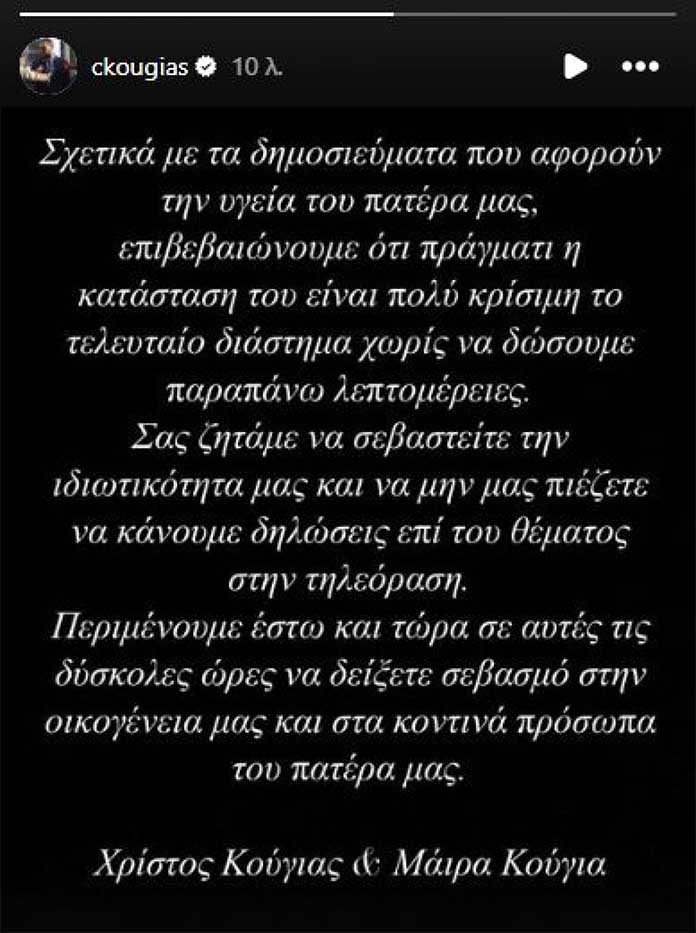 Ανάρτηση στο Instagram στην οποία κάνει λόγο για «πολύ κρίσιμη κατάσταση» του ποινικολόγου, Αλέξη Κούγια, έκανε ο γιος του, Χρήστος, το πρωί της Δευτέρας.