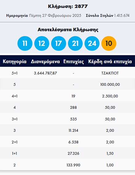 Οι τυχεροί αριθμοί είναι οι: 11, 12, 17, 21, 24