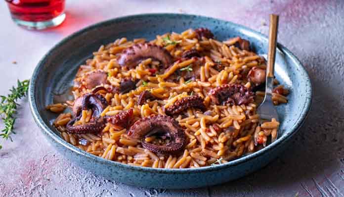 Το κριθαράκι, το μαγικό αυτό ζυμαρικό, σε αυτή τη συνταγή ταίριαξε με το χταπόδι, το κρασί και το κόκκινο πιπέρι.