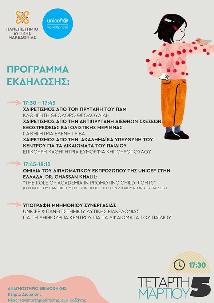 Δημιουργία Κέντρου για τα Δικαιώματα του Παιδιού στο Πανεπιστήμιο Δυτικής Μακεδονίας σε συνεργασία με τη UNICEF