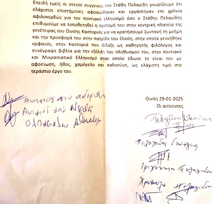 Επειδή εμείς οι στενοί συγγενείς του Στάθη Πελαγίδη γνωρίζουμε ότι ελάχιστοι επιστήμονες αφοσιώθηκαν και εργάστηκαν επι χρόνια αφιλοκερδώς για τον ποντιακό ελληνισμό όσο ο Στάθης Πελαγίδης, επιθυμούμε να τοποθετηθεί η προτομή του στην κεντρική πλατεία της γενέτειρας του Οινόης Καστοριάς, για να κρατήσουμε ζωντανή τη μνήμη και την προσφορά του στην πατρίδα του Οινόη, στην οποία γεννήθηκε ορφανός, στην Καστοριά που δίδαξε ως καθηγητής φιλόλογος και συνέγραψε βιβλία για την εξέλιξη του πληθυσμού του, στον Ποντιακό και Μικρασιατικό Ελληνισμό στον οποίο έδωσε το είναι του με αφοσίωση, ήθος, χαμόγελο και καλοσύνη, ως ελάχιστη τιμή στο τεράστιο έργο του.