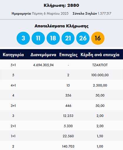 Το ποσό των 4.694.305,94 ευρώ μοίραζε στην σημερινή κλήρωση υπ’ αριθμόν 2880 το τυχερό παιχνίδι του ΟΠΑΠ.