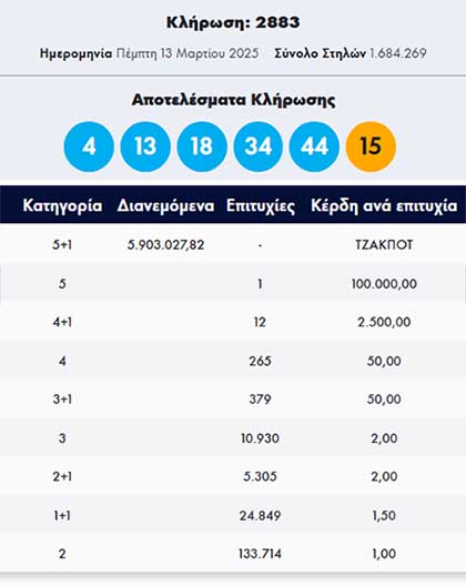 Το ποσό των 5.903.027,82 ευρώ μοίραζε στην σημερινή κλήρωση υπ’ αριθμόν 2883 το τυχερό παιχνίδι του ΟΠΑΠ.