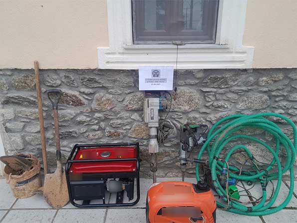 Στην κατοχή των ανωτέρω και σε έρευνες που πραγματοποιήθηκαν σε οικία και σε προσωρινό κατάλυμα, που διατηρούν οι συλληφθέντες, σε περιοχές της Φλώρινας, βρέθηκαν διάφορα σκαπτικά εργαλεία και υποβοηθητικά σύνεργα όπως: συσκευή απάντλησης υδάτων, -2- ηλεκτρικές γεννήτριες, -2- ηλεκτρικά τρυπάνια, τσάπα, φτυάρι και αυτοσχέδιο εκκρεμές που χρησιμοποιείτε ως ραβδοσκόπος.