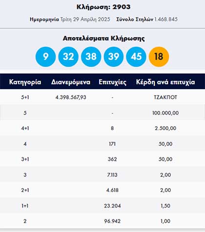 Το ποσό των 4.398.567,93 ευρώ μοίραζε στην σημερινή κλήρωση υπ’ αριθμόν 2903 το τυχερό παιχνίδι του ΟΠΑΠ.