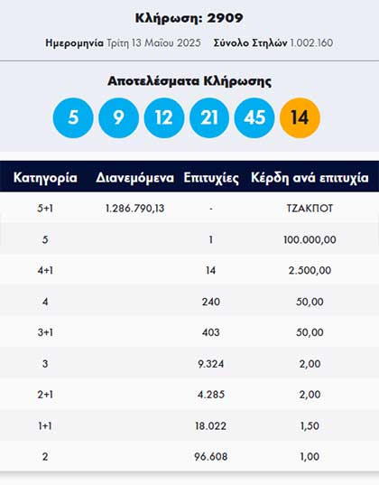 Το ποσό του 1.286.790,13 ευρώ μοίραζε στην σημερινή κλήρωση υπ’ αριθμόν 2909 το τυχερό παιχνίδι του ΟΠΑΠ.