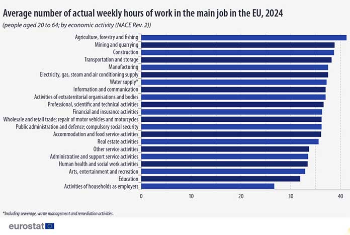 Στην ίδια έρευνα η Eurostat κατέγραψε και τους τομείς δραστηριότητας με τη μεγαλύτερη εβδομάδα εργασίας στην ΕΕ, το 2024.