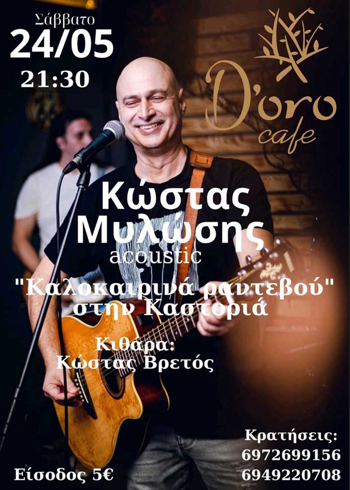 Το Σάββατο 24 Μαΐου στις 21:30, το D’oro cafe στο εμπορικό κέντρο της Καστοριάς υποδέχεται τον αγαπημένο καλλιτέχνη Κώστα Μυλώση για μια ξεχωριστή acoustic βραδιά με τίτλο “Καλοκαιρινά ραντεβού στην Καστοριά”.