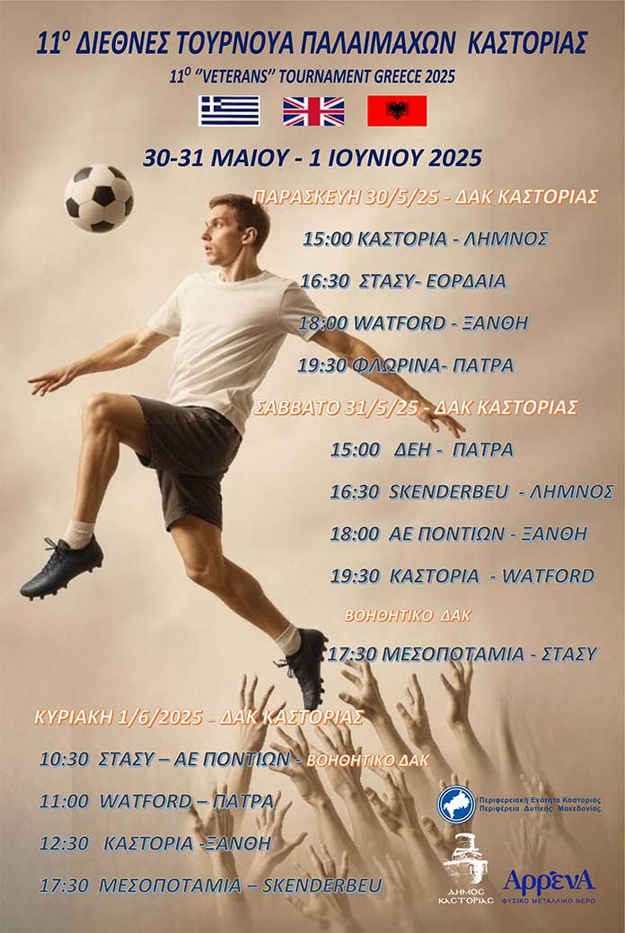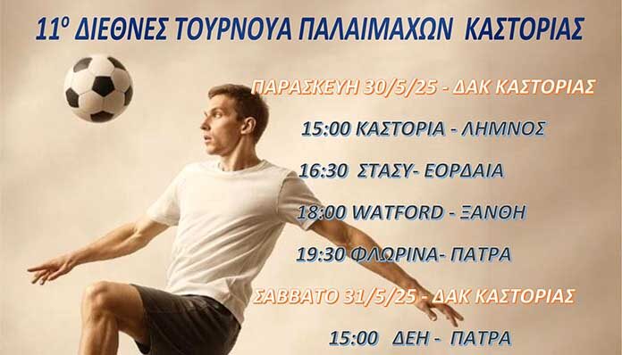 Οι Παλαίμαχοι Καστοριάς διοργανώνουν το 11ο Διεθνές τουρνουά Παλαιμάχων ποδοσφαιριστών,που θα διεξαχθεί στις 30 – 31 Μαΐου –1 Ιουνίου 2025 στο ΔΑΚ Καστοριάς, με 12 ομάδες από την Ελλάδα,την Αγγλία και την Αλβανία,με συνεχομενοσ αγώνες την Παρασκευή και το Σάββατο από τις 15.00 έως τις 22.00, την Κυριακή το πρωί από τις 10.30 έως τις 14.00 αλλά και το απόγευμα από τις 17.30-19.00.