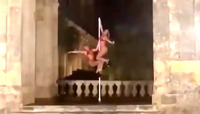Μάλιστα σε βίντεο που αναρτήθηκε στο Facebook από επιχειρηματία της περιοχής φαίνεται ότι υπάρχουν στη σειρά και άλλα μοντέλα έτοιμα να ποζάρουν πάνω στο στύλο με εσώρουχα. Ολα αυτά, στις αψίδες του Ανακτόρου που στέκει εκεί από τον 19ο αιώνα.