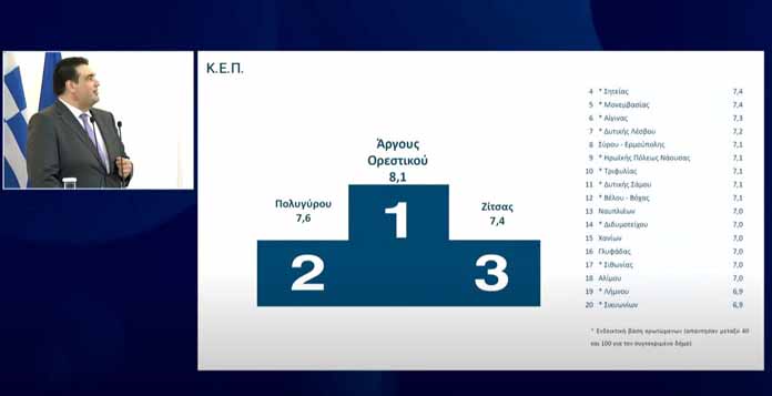 Στην κορυφή της αξιολόγησης δημόσιων υπηρεσιών από τους πολίτες βρέθηκε ο Δήμος Άργους Ορεστικού, σύμφωνα με τα επίσημα αποτελέσματα που παρουσιάστηκαν σήμερα στο Μέγαρο Μαξίμου από τον Υπουργό Εσωτερικών Θεόδωρο Λιβάνιο, παρουσία του Πρωθυπουργού.