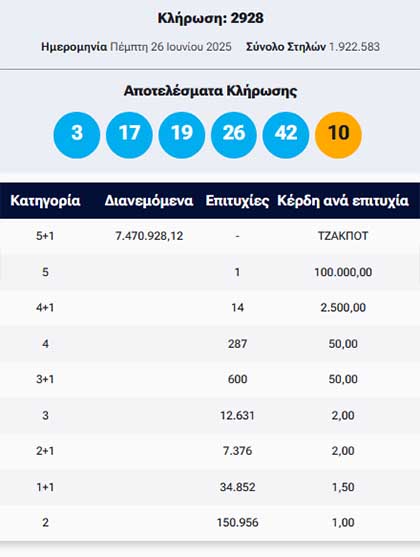 Οι τυχεροί αριθμοί είναι οι: 3, 17, 19, 26, 42