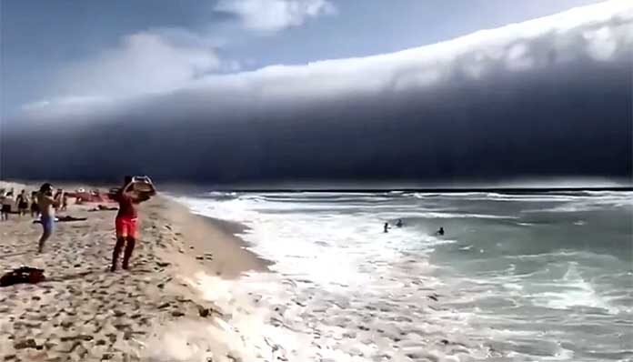 Όπως φαίνεται στο βίντεο που έγινε viral, το σύννεφο είχε σχηματίσει κάτι σαν τείχος δίνοντας την εντύπωση ότι πρόκειται να ξεσπάσει πάνω στην παραλία.