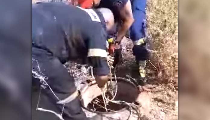 Όταν αυτό έγινε αντιληπτό, ο κτηνοτρόφος κάλεσε την Πυροσβεστική, άνδρες της οποίας έφτασαν στο σημείο και ύστερα από συντονισμένες ενέργειες κατάφεραν να απεγκλωβίσουν το ζώο και να το παραδώσουν σώο και αβλαβές στον ιδιοκτήτη του.