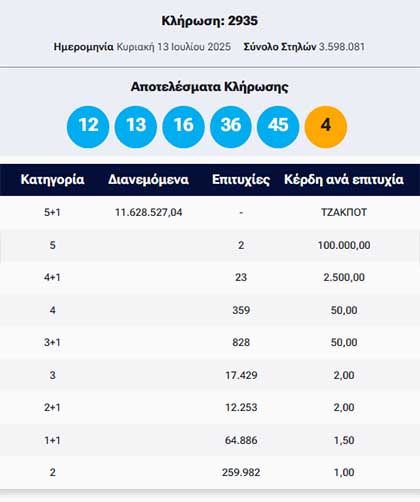 Τζακ-ποτ σημειώθηκε στην πρώτη κατηγορία (5+1) στην κλήρωση του Τζόκερ της Κυριακής 13 Ιουλίου 2025
