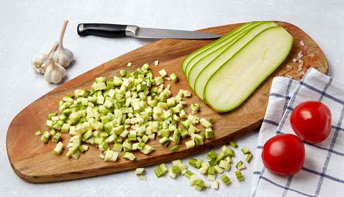 Κόβετε τα κολοκυθάκια σε μικρά κυβάκια.