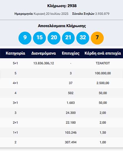 Τζακ-ποτ σημειώθηκε στην πρώτη κατηγορία (5+1) στην κλήρωση του Τζόκερ της Κυριακής 20 Ιουλίου 2025