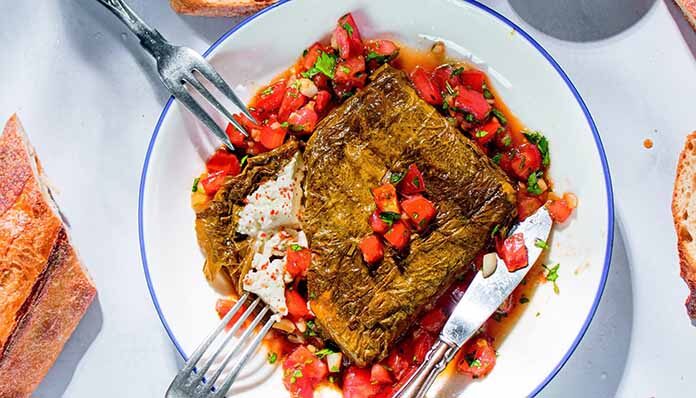Αυτή η συνταγή για την ψητή φέτα που είναι τυλιγμένη σε αμπελόφυλλα αποτελεί έναν πρώτης τάξεως μεζέ – ό,τι πρέπει για το μεσημεριανό τσιπουράκι.