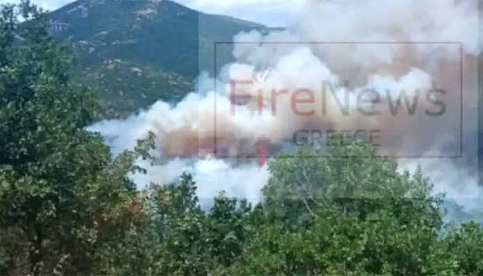 Η φωτιά κατευθύνεται προς το όρος Βουνάσα και οι Αρχές εκκένωσαν κατασκήνωση όπου υπήρχαν 55 παιδιά, σύμφωνα με την ΕΡΤ.