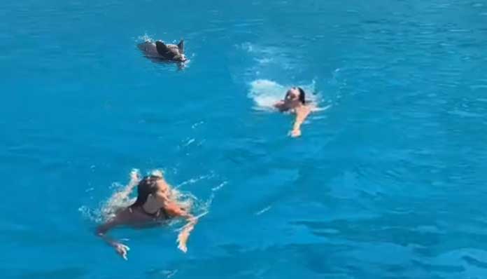 Σε βίντεο που έχει ανέβει στο TikTok φαίνονται οι δύο γυναίκες μέσα στη θάλασσα όταν ξαφνικά εμφανίστηκε ένα αγριογούρουνο να κολυμπάει και να κατευθύνεται προς εκείνες.