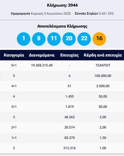 Οι τυχεροί αριθμοί είναι οι: 1, 8, 11, 20, 22