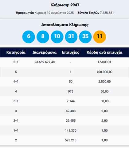 Το ποσό των 23.659.677,48 ευρώ μοίραζε στην σημερινή κλήρωση υπ’ αριθμόν 2947 το τυχερό παιχνίδι του ΟΠΑΠ.