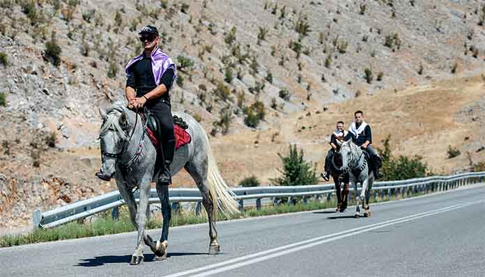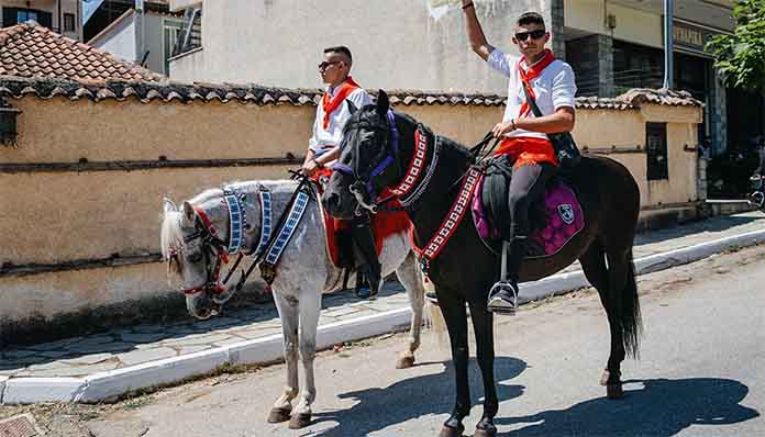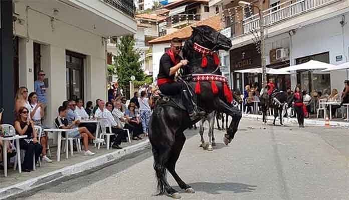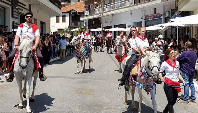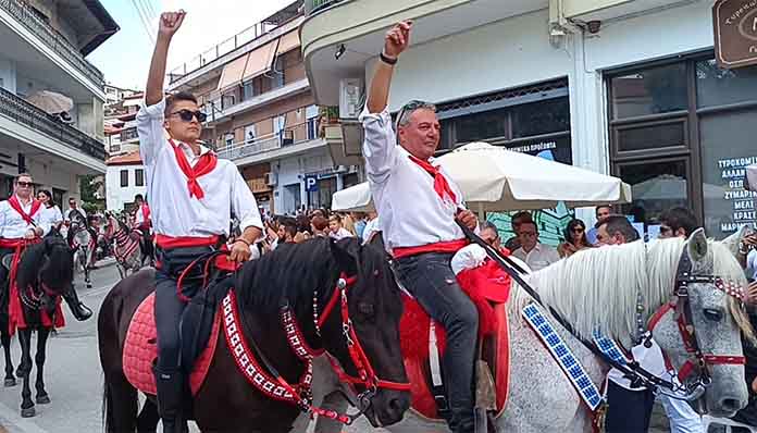 Η μία ομάδα ακολουθεί την άλλη. Τα άλογα ένα-ένα αραδιάζονται στην πλαγιά του βουνού, περπατούν καμαρωτά κι ανάμεσά τους και κανένα γαϊδουράκι που συνήθως έχουν μικρά παιδιά που ακολουθούν τις παρέες. Οι Αρχές του τόπου και πολύς κόσμος περιμένουν και υποδέχονται τους καβαλάρηδες στην είσοδο της πόλεως στην εκκλησία του Αγίου Αθανασίου.