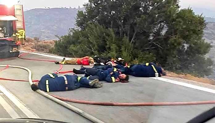 Στη φωτογραφία απεικονίζονται εξουθενωμένοι πυροσβέστες να ξαποσταίνουν σε δρόμο στη Χίο.