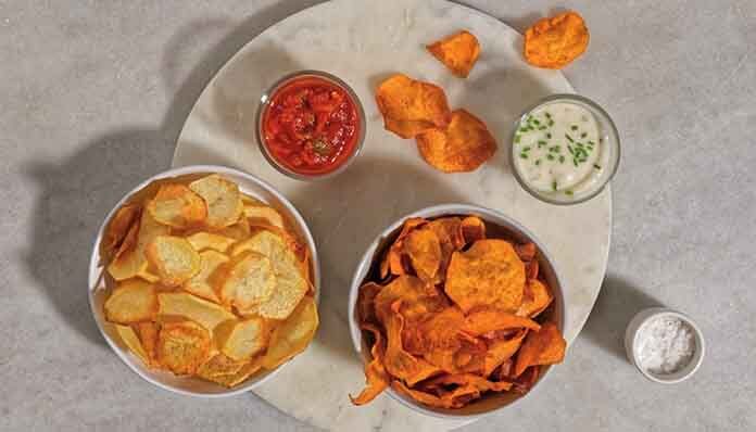 Τα πατατάκια αποτελούν ίσως το πιο αγαπημένο σνακ, μικρών και μεγάλων. Είναι μια απλή, αλλά απολαυστική λιχουδιά, που μπορούμε να φτιάξουμε εύκολα στην κουζίνα μας και την οποία θα απολαύσουμε χωρίς συντηρητικά και… χωρίς τύψεις. Φτιάχνουμε, λοιπόν, τσιπς πατάτας και γλυκοπατάτας, τα οποία συνοδεύουμε με ντιπ γιαουρτιού και ντομάτας.