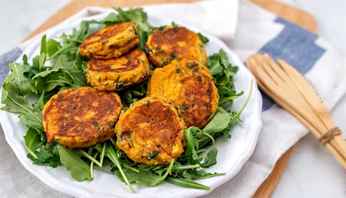 Οι πατατοκεφτέδες είναι ένας αγαπημένος ελληνικός μεζές που ταιριάζει με την ίδια ευκολία ως ένα ορεκτικό ή συνοδευτικό σε ένα τραπέζι, αλλά και ως σνακ στην παραλία ή οπουδήποτε αλλού. Σε αυτή τη vegan και πιο υγιεινή εκδοχή, χρησιμοποιούμε γλυκοπατάτα, γνωστή για την υψηλή της περιεκτικότητα σε βήτα-καροτένιο, αντιοξειδωτικά και φυτικές ίνες, ένα υλικό που έχει συνδεθεί με τις Μπλε Ζώνες και τη μακροζωία και μπορεί να αποτελέσει μια αναβαθμισμένη επιλογή έναντι της απλής πατάτας. Οι γλυκοπατάτες υποστηρίζουν την υγεία του ανοσοποιητικού, ρυθμίζουν το σάκχαρο και χαρίζουν υπέροχη φυσική γλυκύτητα και χρώμα, ενώ μας παρέχουν και πρεβιοτικά για ένα υγιές έντερο. Ψήνοντάς τους, μάλιστα, αντί να τους τηγανίζουμε, μειώνουμε τα λιπαρά χωρίς να χάνουμε καθόλου σε γεύση! Και το αποτέλεσμα είναι πατατοκεφτέδες πλούσιοι σε φυτικές ίνες, πηγή βιταμινών A, C και E, χωρίς ζωικά προϊόντα, με καλά λιπαρά και ανώτεροι σε αντιοξειδωτικά σε σχέση με τους κλασικούς. Πάμε να τους φτιάξουμε;