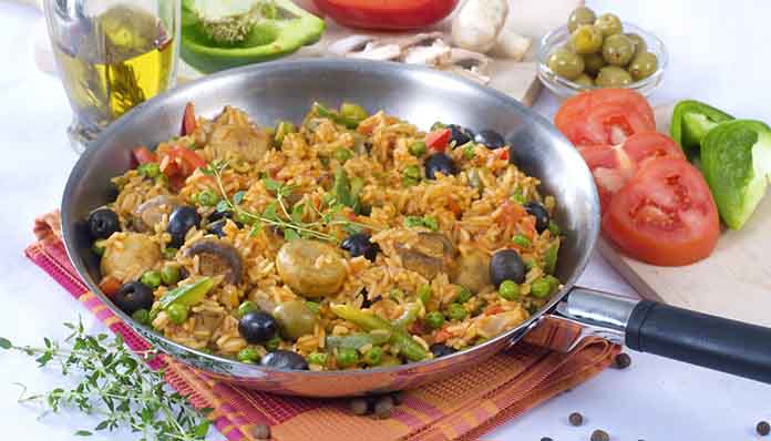 Προσθέστε τις αγκινάρες, τις πιπεριές και τις ελιές. Ανακατέψτε καλά, χαμηλώστε τη φωτιά στο ελάχιστο και αφήστε να μαγειρευτεί χωρίς ανακάτεμα για άλλα 15 λεπτά, μέχρι να απορροφηθεί το μεγαλύτερο μέρος του υγρού. Αν το ρύζι δεν είναι αρκετά τρυφερό, σκεπάστε το σκεύος με καπάκι και αφήστε το για ακόμη 5 λεπτά.