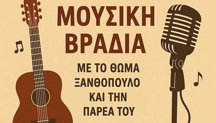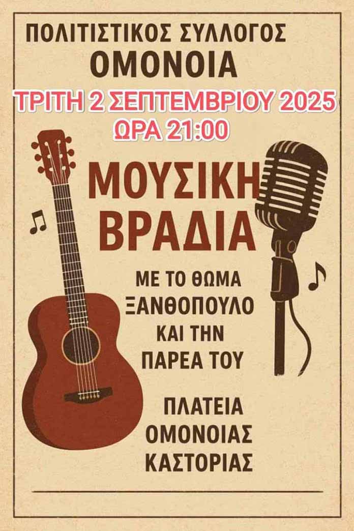 Μουσική βραδιά στην πλατεία Ομονοίας Καστοριάς By mpetskas team - September 1, 2025 Share on Facebook Tweet on Twitter ΠΟΛΙΤΙΣΤΙΚΟΣ ΣΥΛΛΟΓΟΣ ΟΜΟΝΟΙΑ ΤΡΙΤΗ 2 ΣΕΠΤΕΜΒΡΙΟΥ 2025 ΩΡΑ 21:00 ΜΟΥΣΙΚΗ ΒΡΑΔΙΑ ΜΕ ΤΟ ΘΩΜΑ ΞΑΝΘΟΠΟΥΛΟ ΚΑΙ ΤΗΝ ΠΑΡΕΑ ΤΟΥ ΠΛΑΤΕΙΑ ΟΜΟΝΟΙΑΣ ΚΑΣΤΟΡΙΑΣ