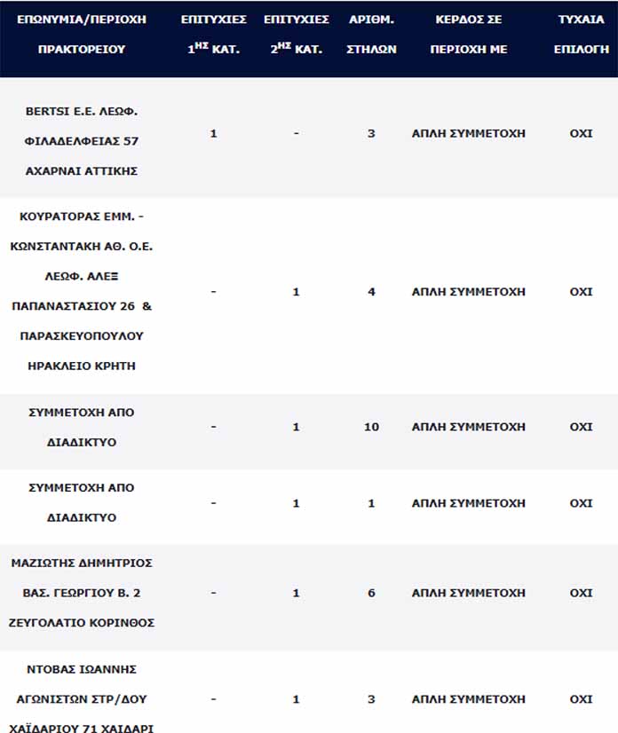 Από τα τυχερά δελτία της 2ης κατηγορίας, τα τρία συμπληρώθηκαν σε καταστήματα του ΟΠΑΠ σε Ηράκλειο Κρήτης, Κόρινθο και Χαϊδάρι και τα δύο μέσω διαδικτύου.