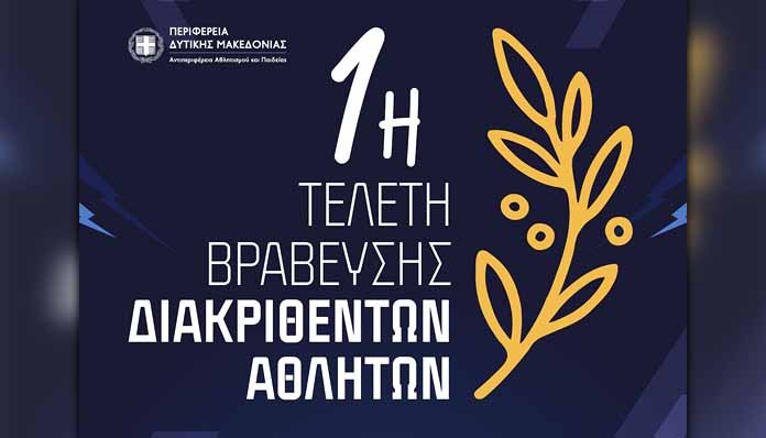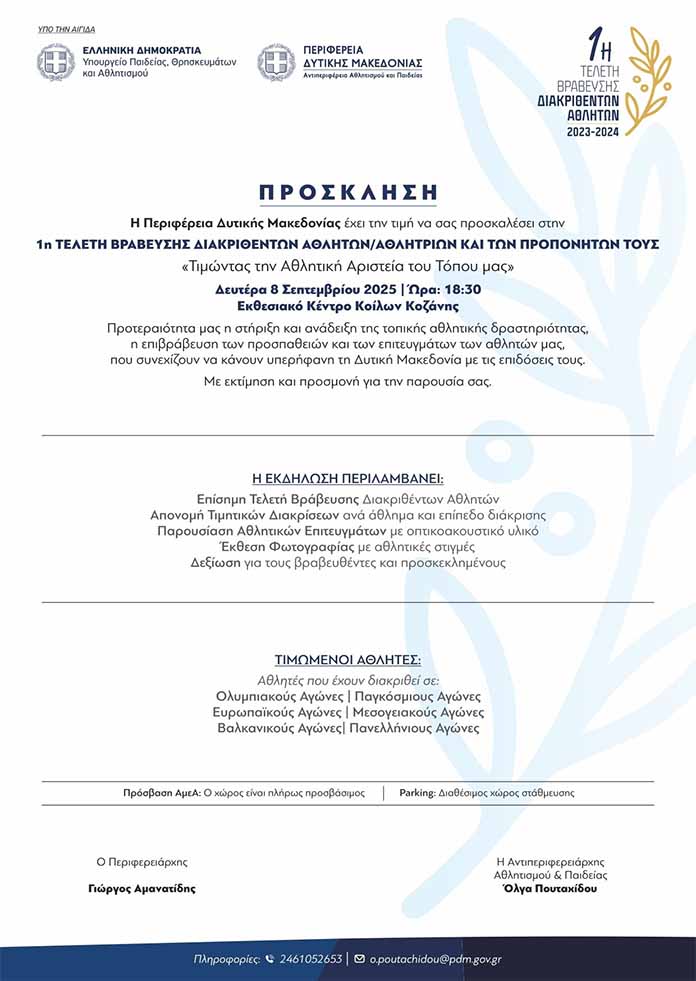 Η Περιφέρεια Δυτικής Μακεδονίας, σας προσκαλεί στην Τελετής Βράβευσης Διακριθέντων Αθλητών/Αθλητριών/Συλλόγων και των Προπονητών τους, που θα πραγματοποιηθεί τη Δευτέρα 8 Σεπτεμβρίου 2025, στις 18:30, στο Εκθεσιακό Κέντρο Κοίλων Κοζάνης.