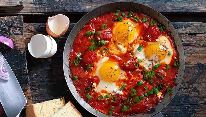Σπάμε τα αυγά κατευθείαν μέσα στη σάλτσα. Σκεπάζουμε και αφήνουμε να ψηθούν για 3-4 λεπτά, μέχρι να πήξει το ασπράδι και ο κρόκος να μείνει μελάτος ή πιο σφιχτός, ανάλογα με τις προτιμήσεις.
