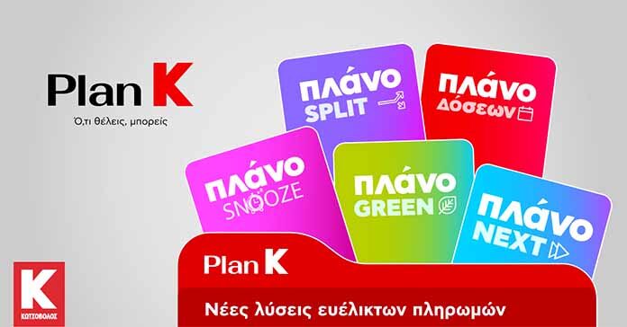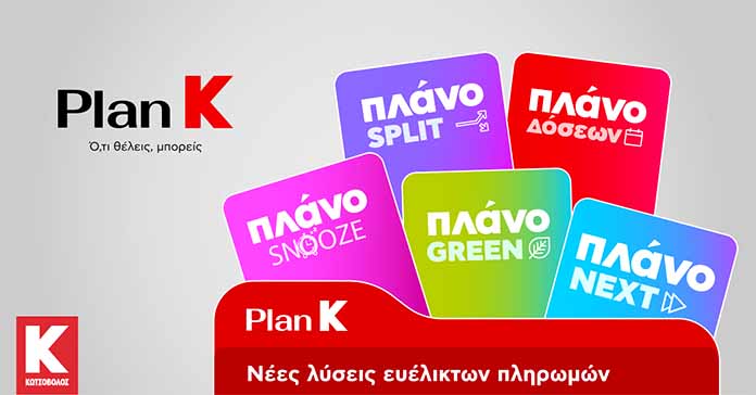 Η Κωτσόβολος φέρνει την επόμενη ημέρα στο Retail με το Plan K, μία ολοκληρωμένη σειρά χρηματοδοτικών εργαλείων που βάζει τον καταναλωτή στο επίκεντρο και του δίνει περισσότερη ευελιξία από ποτέ με στόχο μια Καλύτερη Ζωή. Μέσα από σύγχρονα χρηματοδοτικά εργαλεία και ευέλικτους τρόπους πληρωμής, το Plan K επιτρέπει σε κάθε καταναλωτή να αποκτήσει αυτό που επιθυμεί με τον τρόπο που τον εξυπηρετεί, ανεξάρτητα από τη φάση της ζωής του ή το μέγεθος της αγοράς που θέλει να πραγματοποιήσει.