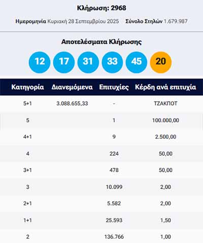 Τζακ-ποτ σημειώθηκε στην πρώτη κατηγορία (5+1) στην κλήρωση του Τζόκερ της Κυριακής 28 Σεπτεμβρίου 2025