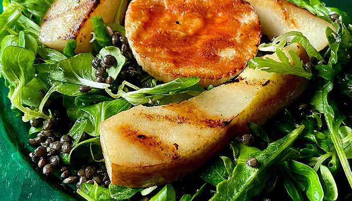 Φθινοπωρινή σαλάτα με ψητά αχλάδια, ψητό ταλαγάνι και μαύρες φακές