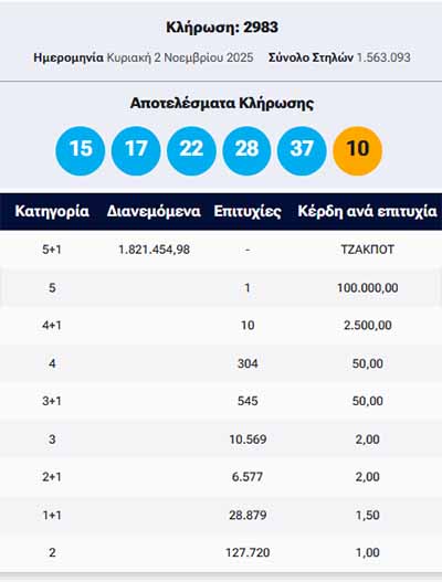 Το ποσό του 1.821.454,98 ευρώ μοίραζε στην σημερινή κλήρωση υπ’ αριθμόν 2983 το τυχερό παιχνίδι του ΟΠΑΠ.