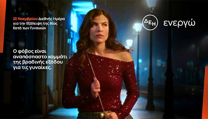 Για πέμπτη συνεχή χρονιά η ΔΕΗ συμμετέχει ενεργά στη Διεθνή Ημέρα για την Εξάλειψη της Έμφυλης Βίας, φωτίζοντας μια καθημερινή και βαθιά ριζωμένη εμπειρία ανασφάλειας, τον φόβο που βιώνουν γυναίκες όλων των ηλικιών κατά τη βραδινή τους έξοδο. Η νέα πανελλαδική έρευνα επιβεβαιώνει ότι για 8 στις 10 γυναίκες η επιστροφή από μια βραδινή έξοδο δεν αποτελεί μια απλή διαδρομή, αλλά μια διαδικασία που συνοδεύεται από φόβο, επιφύλαξη και συστηματικά μέτρα αυτοπροστασίας.