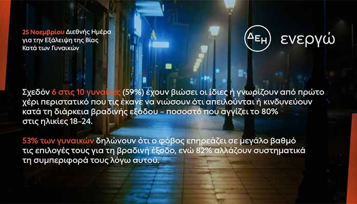 - Νέα πανελλαδική έρευνα, με πρωτοβουλία της ΔΕΗ, αποκαλύπτει ότι 8 στις 10 γυναίκες φοβούνται όταν κυκλοφορούν βράδυ και 6 στις 10 έχουν βιώσει ή γνωρίζουν περιστατικό απειλής