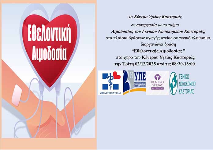 Δράση Εθελοντικής Αιμοδοσίας στο Κέντρο Υγείας Καστοριάς By mpetskas team - November 27, 2025 Share on Facebook Tweet on Twitter Δράση Εθελοντικής Αιμοδοσίας, θα πραγματοποιηθεί στο Κέντρο Υγείας Καστοριάς σε συνεργασία με το τμήμα Αιμοδοσίας του Γενικού Νοσοκομείου Καστοριάς. Προσκαλούμε τους ενδιαφερόμενους πολίτες να προσέλθουν στο χώρο μας ώστε να δώσουν αίμα εθελοντικά.