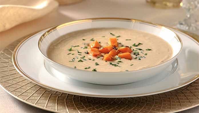 Σερβίρουμε τη σούπα σε πιάτα ρίχνοντας λίγο σχοινόπρασο από πάνω και γαρνίροντας με τις καραμελωμένες γλυκοπατάτες.